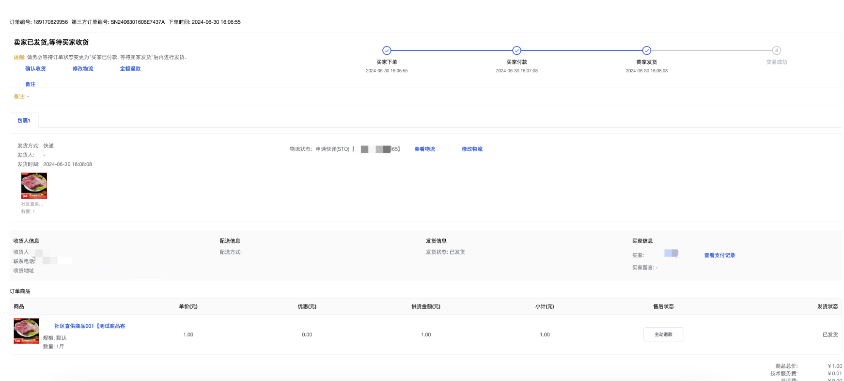• 订单金额汇总:商品总价、技术服务费(会员/采购端技术服务费)、运费、订单总额;