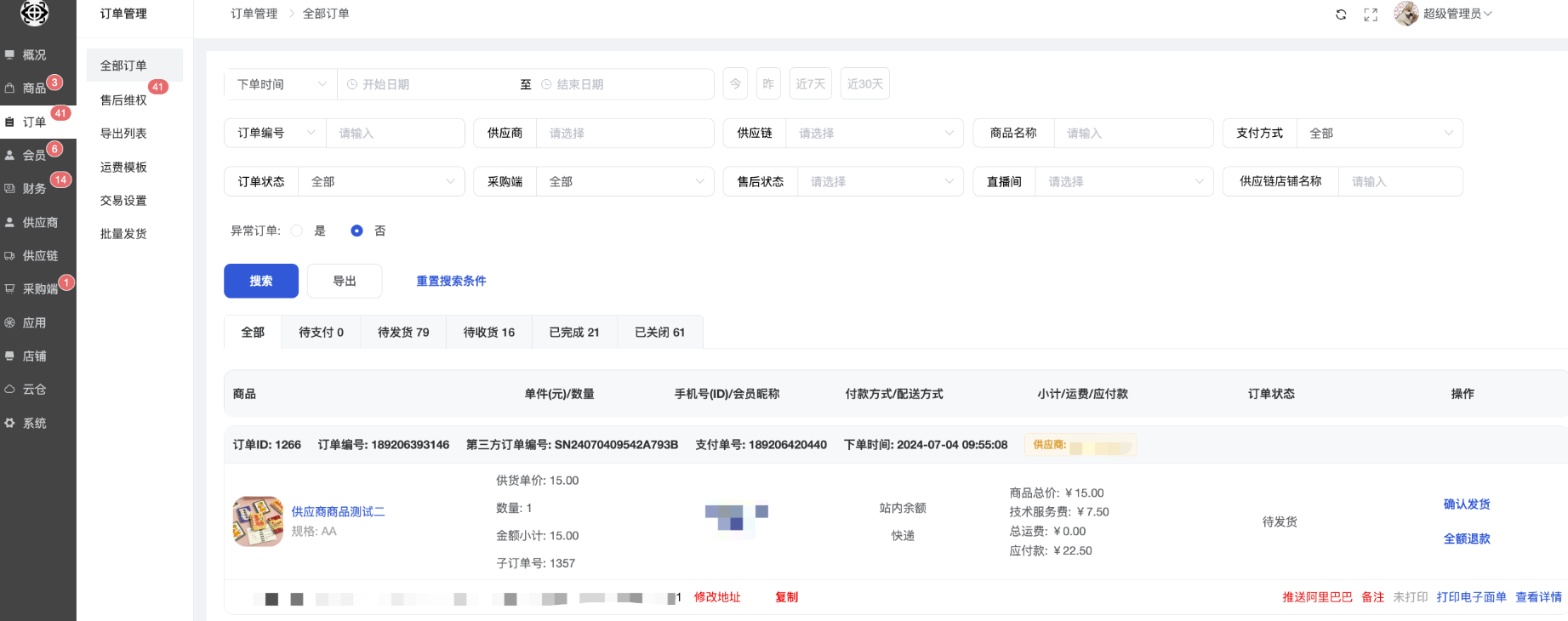 (3)供应链:支持筛选指定供应链的商品订单;