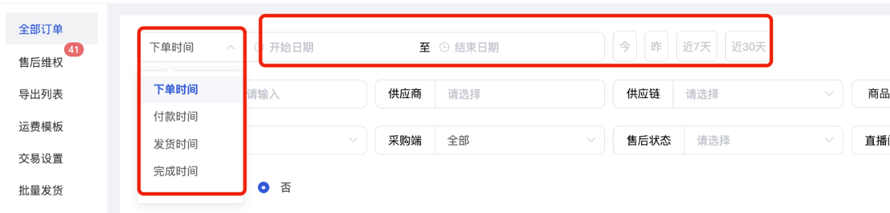(2)供应商:支持筛选平台自营、全部供应商、指定供应商订单;