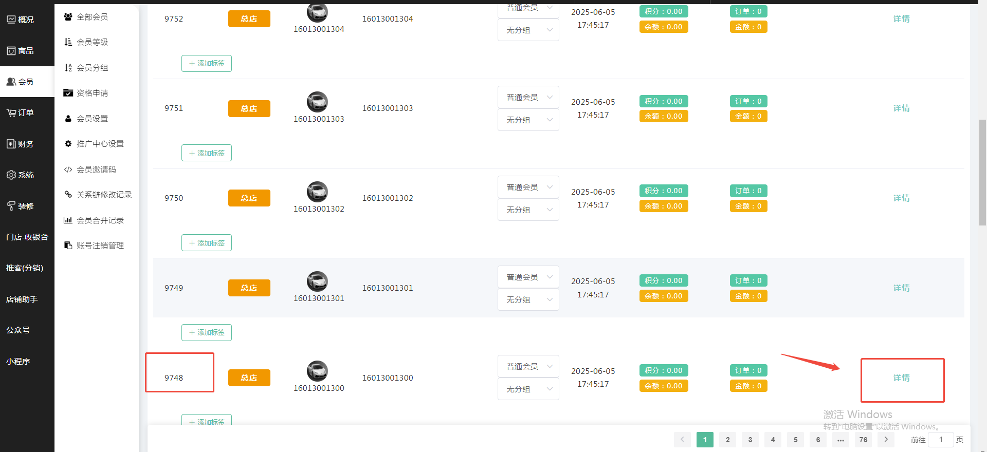 第九步,复制会员ID:9748的9748,找到会员ID:9749点击详情--找到推荐人--开启推广员,点击推荐人的修改按钮--填上一级的会员ID号--保存