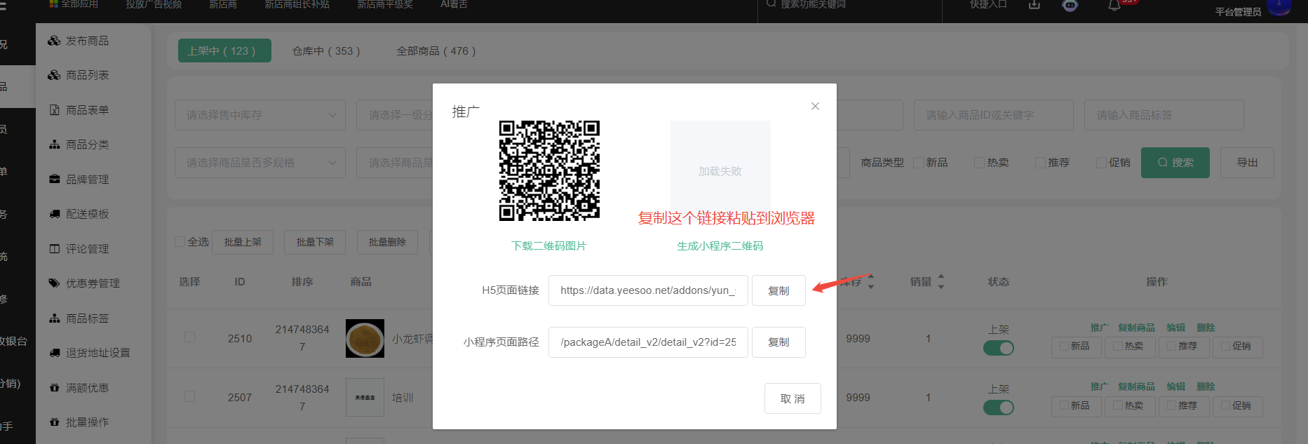 第十步,找测试的商品--复制该商品的H5链接粘贴到浏览器