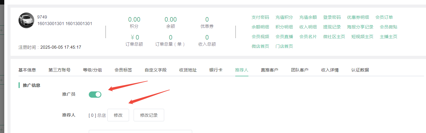 第八步,点击推荐人--开启推广员按钮--点击保存键